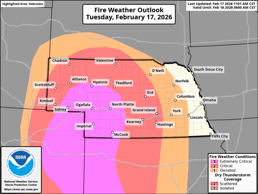 Fire weather is defined as “extremely critical” in western Nebraska, northwest Kansas, and northeast Colorado today, a high-end day for this region.
