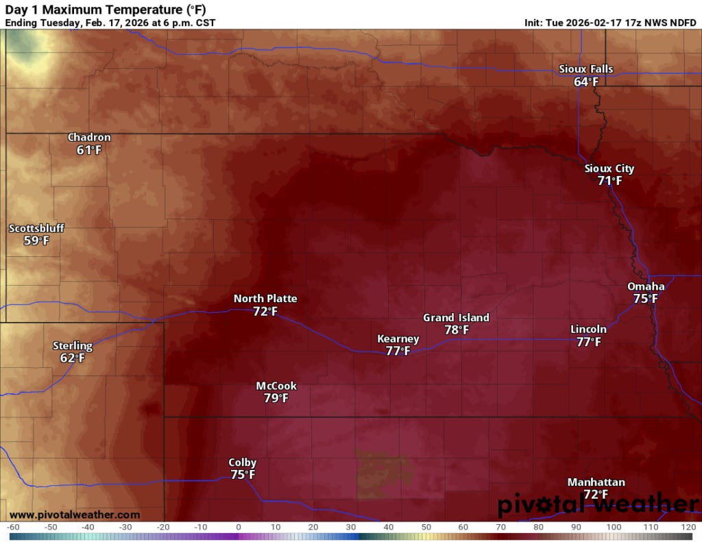 In addition to the winds, we are going to see some potential record warmth in the Central U.S., with much of Nebraska likely to push records well into the 70s. Even Abilene, Texas is expected to hit the mid-80s today, tying a daily record from the late 1800s.